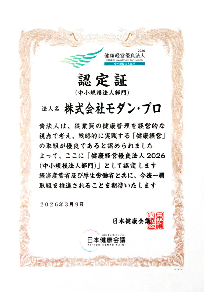 この度、当社は、経済産業省および日本健康会議が共同で実施する「健康経営優良法人認定制度」において、「健康経営優良法人2026(中小規模法人部門)」に認定されました。