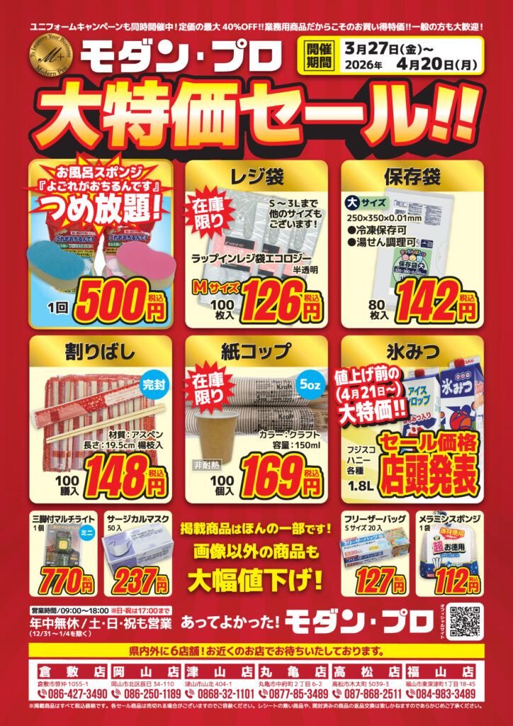2026.03.27 / 最終更新日 : 2026年3月27日 高松店 高松店 春の大特価セール♪ 本日3月27日(金)から4月20日(月)まで 春の大特価セールがスタートいたしました! 在庫限りですがレジ袋がお買い得となっております!! また、氷みつが値上げ前の大特価でお買い得です! 他にも写真以外の商品も値下げ商品ございます。ご来店お待ちしております★