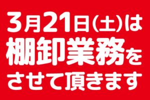 2026.03.19 / 最終更新日 : 2026年3月19日 本社 倉敷店 3月21日(土)棚卸しのお知らせ 3月21日(土)は、棚卸し業務をさせていただきます。 店舗は、通常通り9時〜18時まで営業してお […] [続きを読む]